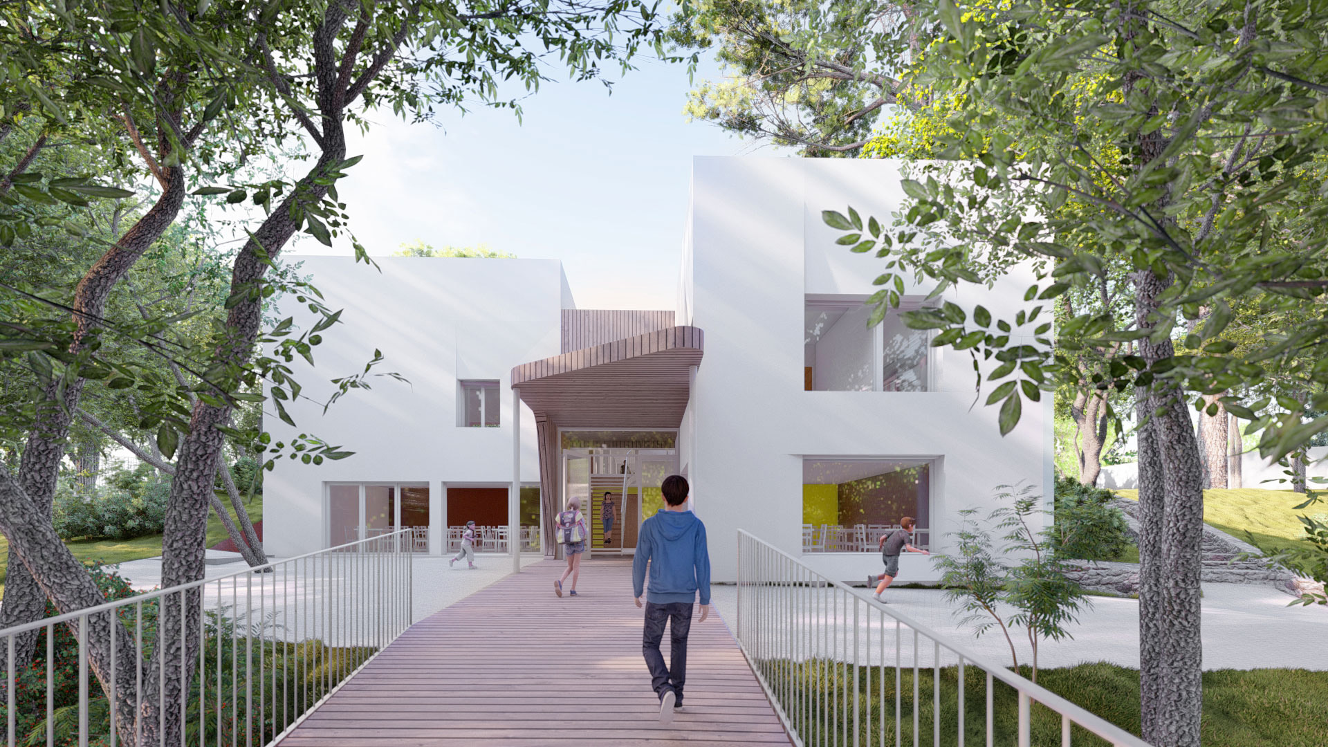 Nous l'adaptons aux besoin d'un ERP. Toutes les parties que nous travaillons sont en contraste avec du bois, du métal et des arrondis. Nous avons inversé les accès de la maison. Le nouvel accès se fait via une passerelle, mettant à même niveau les PMR et non PMR.