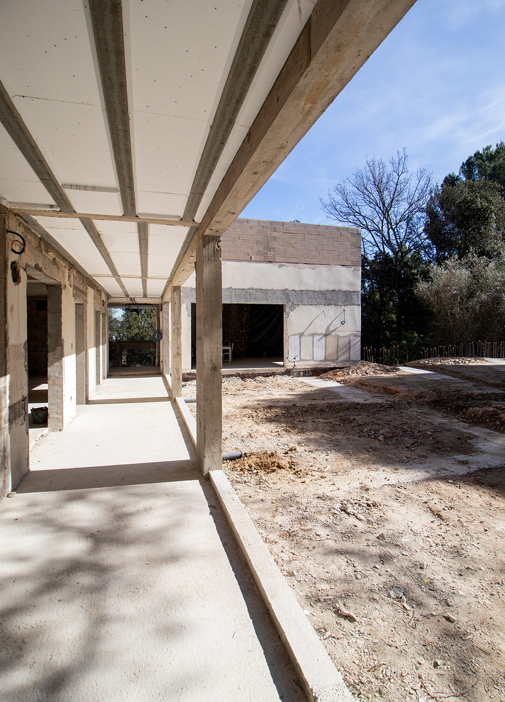 Cette passerelle déambule au milieu des arbres pour rejoindre la maison dans son nouvel axe en partie basse qui dessert différents espaces, salle d'activités et un espace exterieur très généreux sous une terrasse largement ombragée.